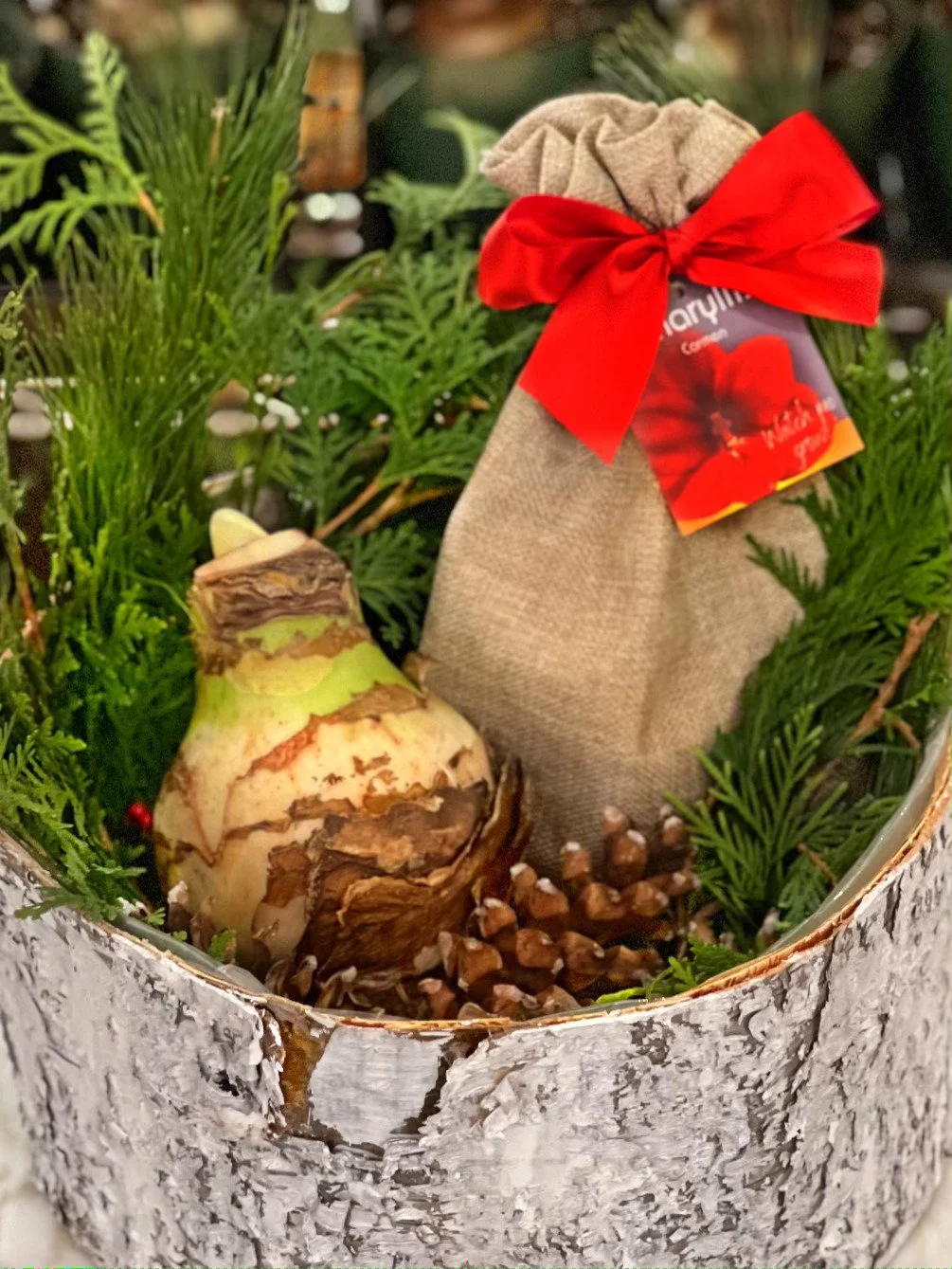 if you are purchasing a dormant bulb, you’ll have the pleasure of potting it! Pick a pot that is snug for the bulb, no more than one inch of space from the bulb to the edge of your pot. If planting a duo or trio of bulbs together, you can plant them snug, with about an inch of space in between your bulbs. Place them in loose, well draining potting soil and leave one-half to one-third of the bulb’s top exposed. Water soil thoroughly, until it drains from the bottom of the pot, and do not water again until you see a green stem emerging from your bulb OR if you find the soil dry to the touch. Once your Amaryllis has woken and you see a stem emerging, follow a regular watering routine, weekly, or, as needed.